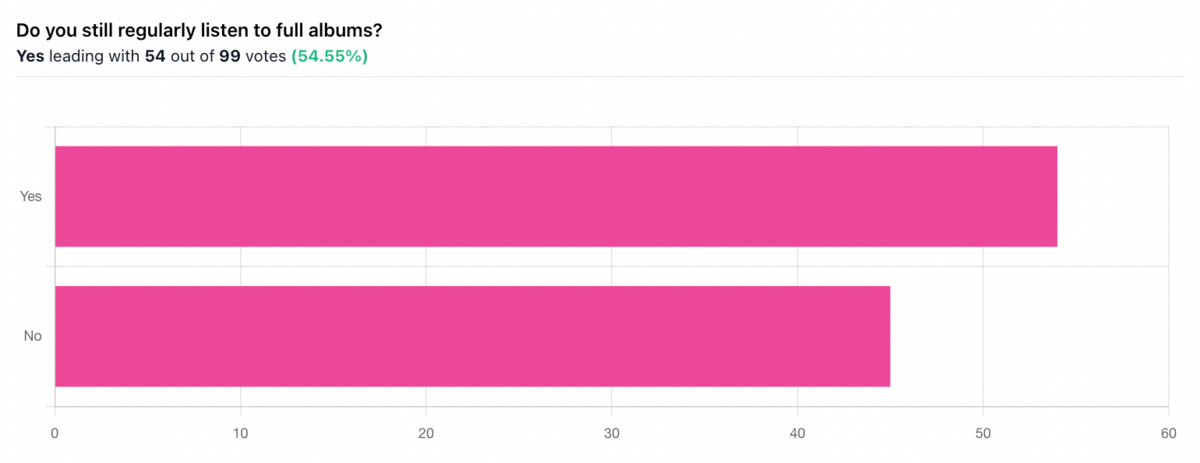Starting with the answers to Friday's poll. Good news for the album-lovers still out there. I dropped a crazy recommendation in the Monday Music section later in the email.