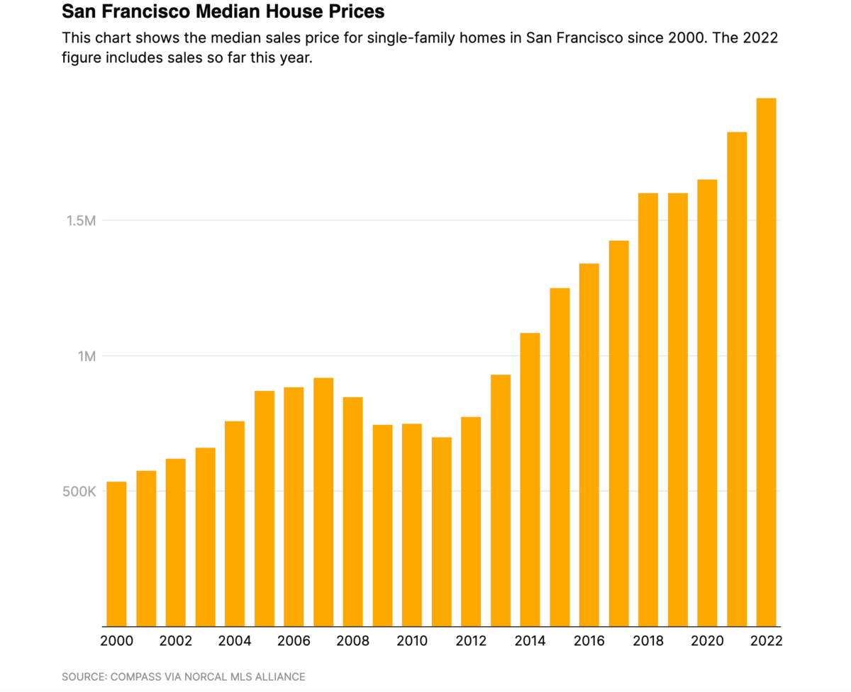 Stat: If you’re looking to move to SF in the near future, now might be the time. Compared to one year ago, overall home sales in the city during May were down 8%. That doesn’t necessarily mean that SF’s absurd housing market has cooled—median sales prices (illustrated in the chart above) are still up year-over-year—but it does show a decline in demand. Looks like the great Austin and Miami exodus was bigger than expected.