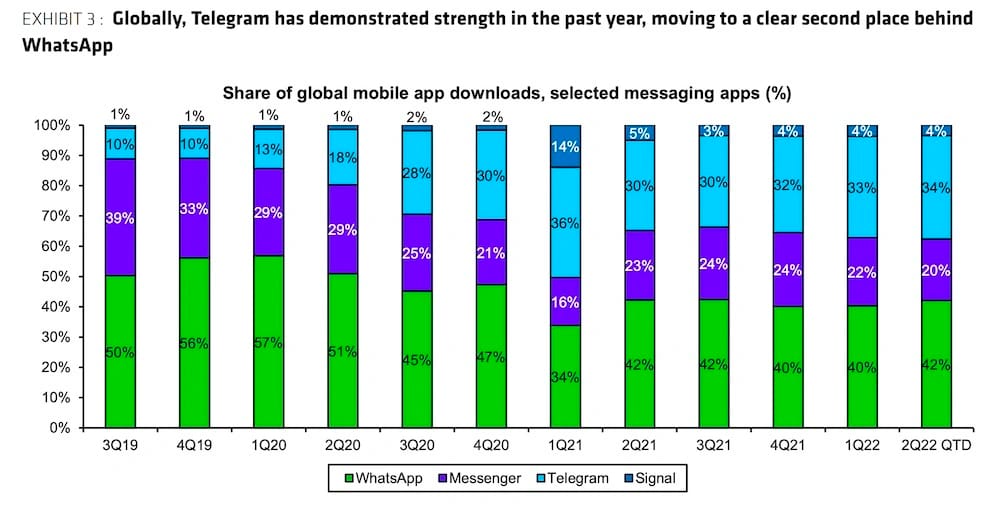 Stat: Telegram passed the 700 million monthly active user mark just 6 months after crossing 500 million. It celebrated the milestone by launching Telegram Premium which comes with a bunch of features like increased storage and file upload size. Worth noting—Telegram has snagged 34% of the messaging market despite never having paid for an ad. Now that’s called product-market fit.